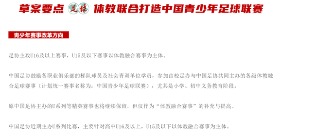 而在2021年,根据《足球报》透露的消息。中国足协将在青超联赛的基础上升级,创立“中国青少年足球联赛”这项赛事将通过各方面改革,打破体教壁垒,促进职业梯队进入校园、带动校园足球水平提高。这一系列动作的具体执行详请我们日后详述。