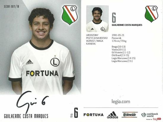 虽然出自足球王国巴西,但吉列尔梅职业生涯从未在南美效力。迄今为止,他效力时间最久的是波兰首府的豪门球队华沙莱吉亚。2014年1月,22岁的吉列尔梅转会至华沙军团。但他的开局堪称噩梦,在为球队出战2场后,突如其来的骨折导致他赛季报销,处子赛季的数据定格为2场0球0助攻。尽管如此,他还是被球迷评为二月最佳球员,他极具治愈的暖心微笑收获了大批华沙球迷的欢心。
