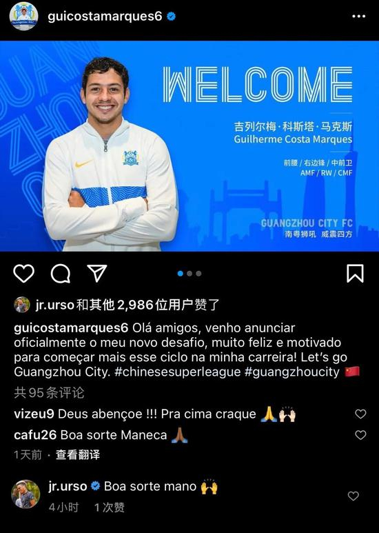 同是巴西球员,吉列尔梅与乌索私交甚好。众所周知,巴西外援乌索曾于2017-18年在富力(广州城)效力,对广州这座城市和球队颇为熟悉。在吉列尔梅转会至广州城之前,曾与乌索有过交流,“我知道他曾在这里踢球,他给了我很多建议,无论场上场下。”在小吉看来,这些中肯的意见,或许能帮助他更快地融入广州城。