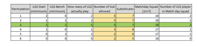 没有U22首发,但替补名单里有一名U22选手,替补名单里缩减为六人,实施换俩人制。