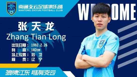 经与本人协商一致,即日起,球员张天龙正式加盟南通支云足球俱乐部。2021赛季,这名正值当打之年的东北小伙将身披蓝色战袍,为南通而战!