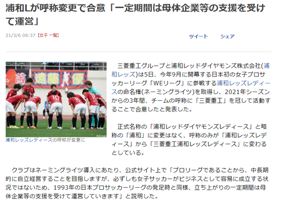 3月5日,日本三菱重工集团和浦和红宝石股份有限公司联合发布消息,称三菱重工获得了将参加全新日本女足职业联赛队伍“浦和红宝石女足队(Urawa Red Diamonds Ladies)”的冠名权。从2021赛季开始的三个赛季中,浦和红宝石俱乐部下属的女足队伍将以“三菱重工浦和红女队(Mitsubishi Heavy Industries Urawa Reds Ladies)”的队名参赛。