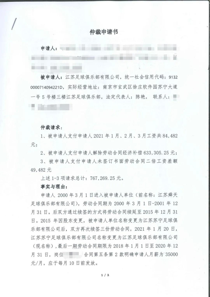 3月15日,律师团队代理员工方赴南京市玄武区劳动人事争议仲裁委员会,对俱乐部拖欠的2021年前3个月工资、2020年拖欠的奖金、经济补偿和二倍工资提起仲裁,本次集体争议劳动者各项诉求涉案总金额3,053,122元,其中经济补偿是最大的一笔,总额超过200万元。