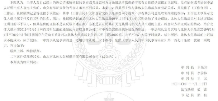 值得一提的是,在中国足坛曾有过类似的判决案例。据律师表示,北京北体大足球俱乐部有限公司与肖其明劳动争议([2019]京0101民初13854号)就由劳动仲裁委和人民法院管辖,肖其明提交了工作合同、社保缴费记录等等证据证实其劳动关系,俱乐部以非劳动关系抗辩未被北京市东城区人民法院采纳。
