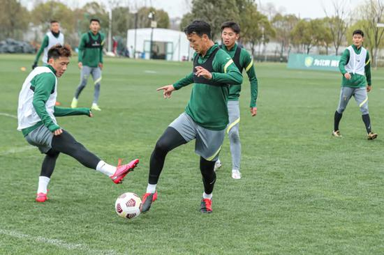 上午11点,上海前滩体育公园里的两块场地上,北京国安一队和U19梯队分别开始了各自的训练。
