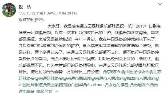 此外,今天还发生了前南通支云球员祝一帆在社交媒体上发文讨薪,指责南通支云拒不执行足协仲裁,拖欠薪水,欺压球员。祝一帆在社交媒体上写道:今年一月初,我在中国足协的仲裁判决下来了,并没有拿到我该拿到合同内的薪资,虽不满意但本着理解的态度选择了接受……就是这样,两个多月过去了,南通支云足球俱乐部拒不支付,拒不执行中国足协仲裁委员会的裁决,完全不把足协判罚当回事。明明已经判决下来的一纸胜状,俱乐部视而不见……”