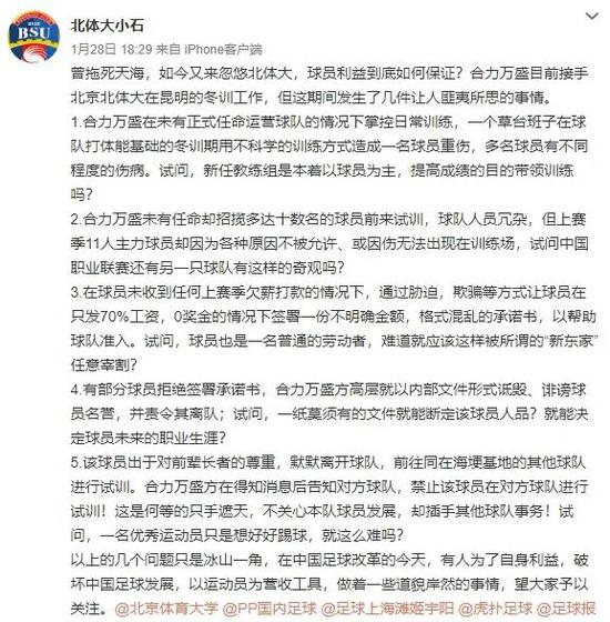 与内蒙古中优一样,北体大的运营方也发生了改变,今年年初,有媒体报道称,曾经主导收购天津天海的合力万盛已经获得了北体大俱乐部的运营权,与此同时,年过花甲已从万达退休、曾任大连一方总经理的石雪清被任命为俱乐部常务副总。本以为这轮人事调整后,北体大足球俱乐部能步入正轨,但今年 1 月 29 日,中国足协要求三级职业联赛提交《工资奖金确认表》前夕,微博名称“北体大小石”的博主在微博公开爆出合力万盛通过胁迫,欺骗等方式让球员在只发 70% 工资,0 奖金的情况下签署一份不明确金额,格式混乱的承诺书,同时还对合力万盛接手北体大后的一系列做法极度不认可,表达了强烈不满。