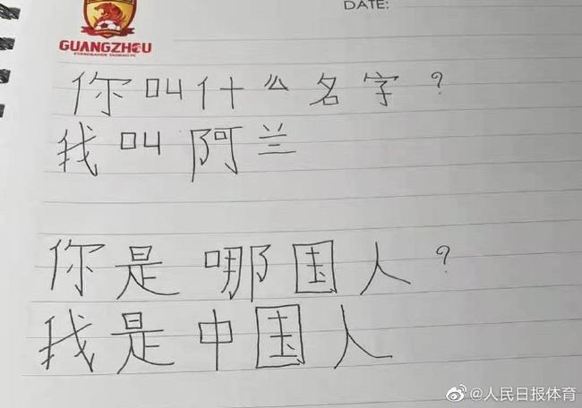 3月24日,《人民日报》体育部在官方微博上发布了一条阿兰努力学习中文的上课视频,并晒出阿兰手写出来的汉字。
