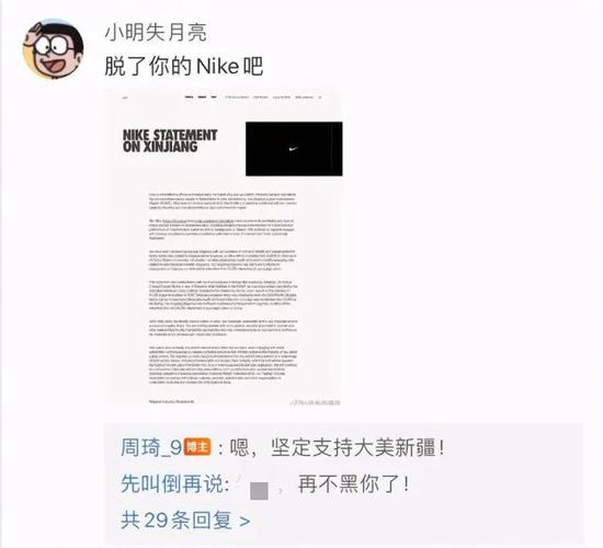 当评论区有球迷写道:“脱了你的耐克吧!”周琦回复:“嗯,坚定支持大美新疆!”