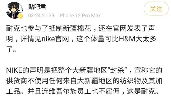 耐克目前还未发表回应,但当他们选择抵制新疆棉花后,中国体育市场也面临着选择。