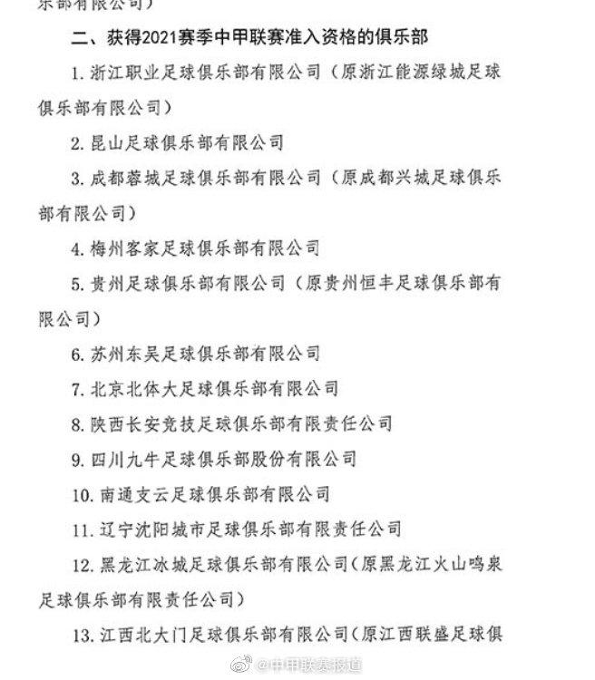 北京时间3月29日,中国足协公布三级联赛准入名单,近期风云不断的中甲联赛的准入情况也最终确定,泰州远大、内蒙古中优与降级的北京人和无缘各级联赛,除了成功升级的武汉三镇与淄博蹴鞠外,新疆天山雪豹、南京城市(南京枫帆)与北京理工成功递补;而由于天津津门虎的准入,浙江队无缘递补新赛季中超。