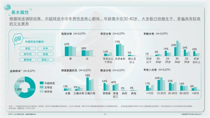 《白皮书》引用调研结果显示:中超球迷男女比例为62:38;本科学历占比高达75%;30到40岁,及40到50岁占比为33%和24%%;已婚已育为78%;管理者为54%;收入10到20万、20到30万的人群分别达到34%和25%。