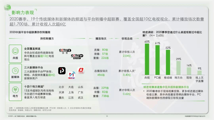 新媒体平台累计收视人数达到了3.4亿,这个数据和2019年相比并没有出现明显的下降,尽管比赛场次下降了33.3%。折合成轮均收视人数,2020年比209年有了高达44%的增长。