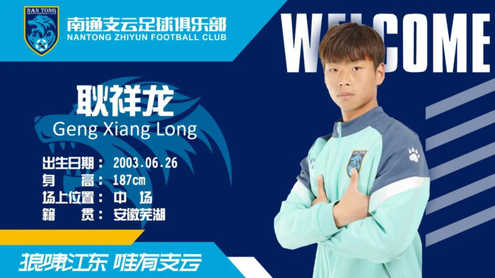 耿祥龙,2003年6月26日出生,身高187CM,司职中场。来自安徽芜湖的小伙天生就有一股子冲劲,在支云的锻炼也让他在球场上展现出了不同于年纪的沉稳。