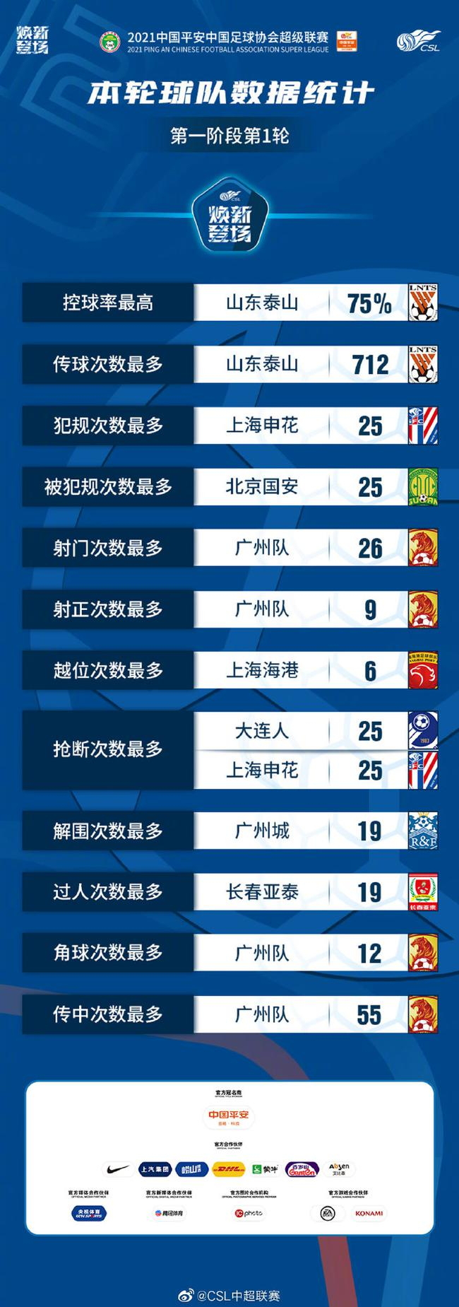北京时间4月25日消息,2021赛季中超新赛季第一阶段第1轮的8场比赛全部结束,中超官方发布了第一阶段第1轮球队数据统计。