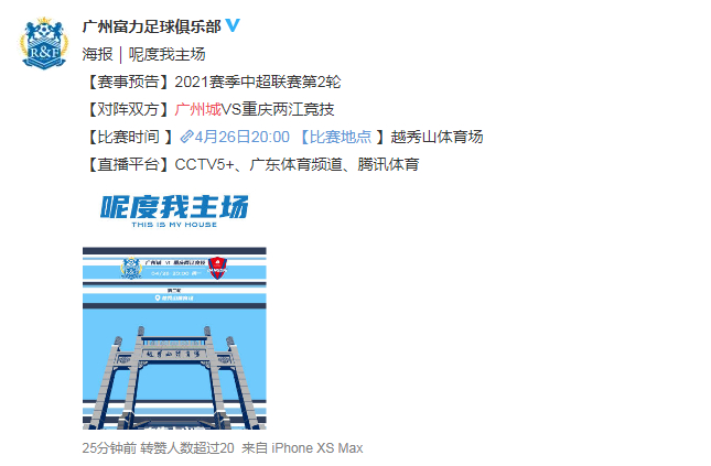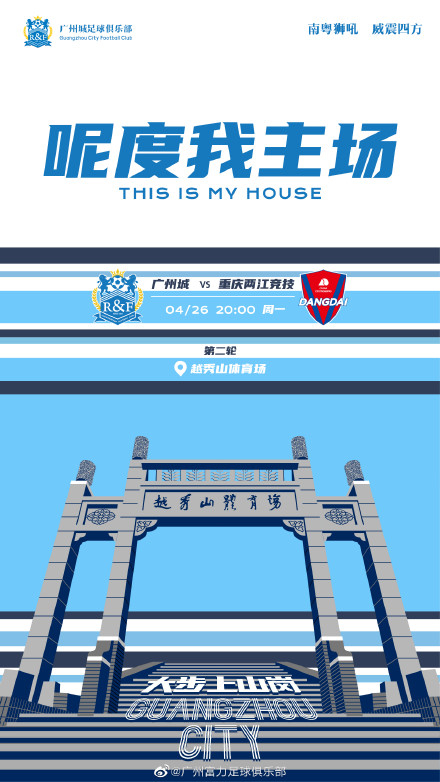 4月25日,广州城将在越秀山体育场迎战重庆两江竞技。赛前广州城官方发布海报,主题为:“呢度我主场”,展现了主场作战的自信和底气。