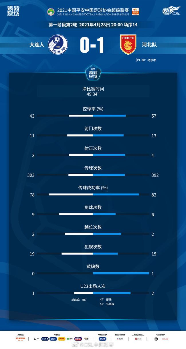 4月28日,中超第2轮,大连人对阵河北。马尔康命中点球,最终河北队1-0战胜大连人。