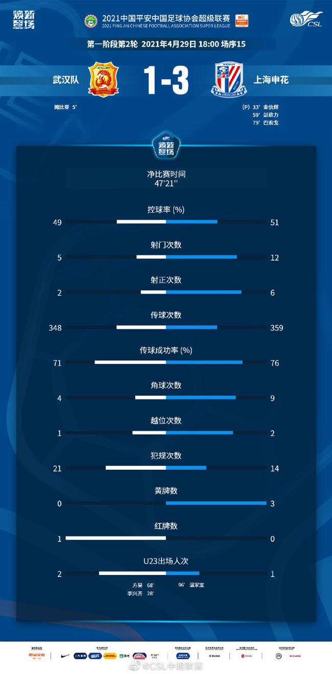 北京时间4月29日晚18点,2021年中超联赛第二轮武汉队对阵上海申花的比赛,在江阴市体育中心开始。开场第4分钟,李行开出右路角球,姆比亚头球首开纪录。第30分钟姆比亚防守中推倒莫雷诺,申花队获得点球机会,金信煜操刀主罚命中。半场两队1比1踢平。第58分钟曹赟定左路推传低平球,吴曦再传,彭欣力起左脚侧身怒射反超比分,2比1。第78分钟阿德里安后场长传,巴索戈得球从右侧带球突入禁区推射远角打进加盟申花后首球。第79分钟赵宏略飞踹巴索戈被直接罚下。最终上海申花3比1战胜武汉队,拿下联赛两连胜。