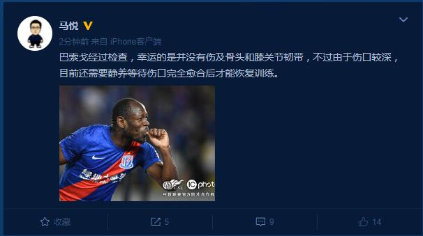 申花新闻官:巴索戈未伤及骨头和关节韧带 需静养