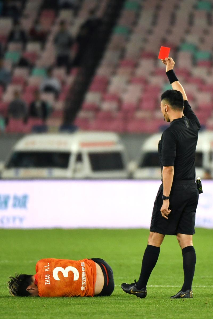 申花与武汉之间的比赛,过往也曾火药味十足。就在巴索戈进球后不久,被赵宏略防守时非常鲁莽地空中蹬踏。从慢镜头可以清晰地看到,赵宏略在争抢皮球的时候,右脚直接踢到了巴索戈右脚的膝盖。当执主裁判随即向赵宏略出示红牌。