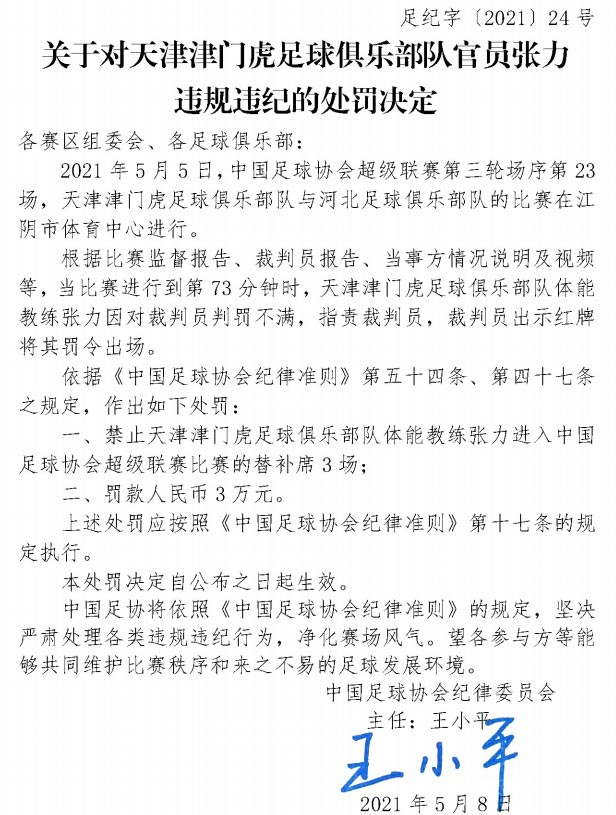 而津门虎官员张力因指责裁判员,被禁赛3场罚款3万。