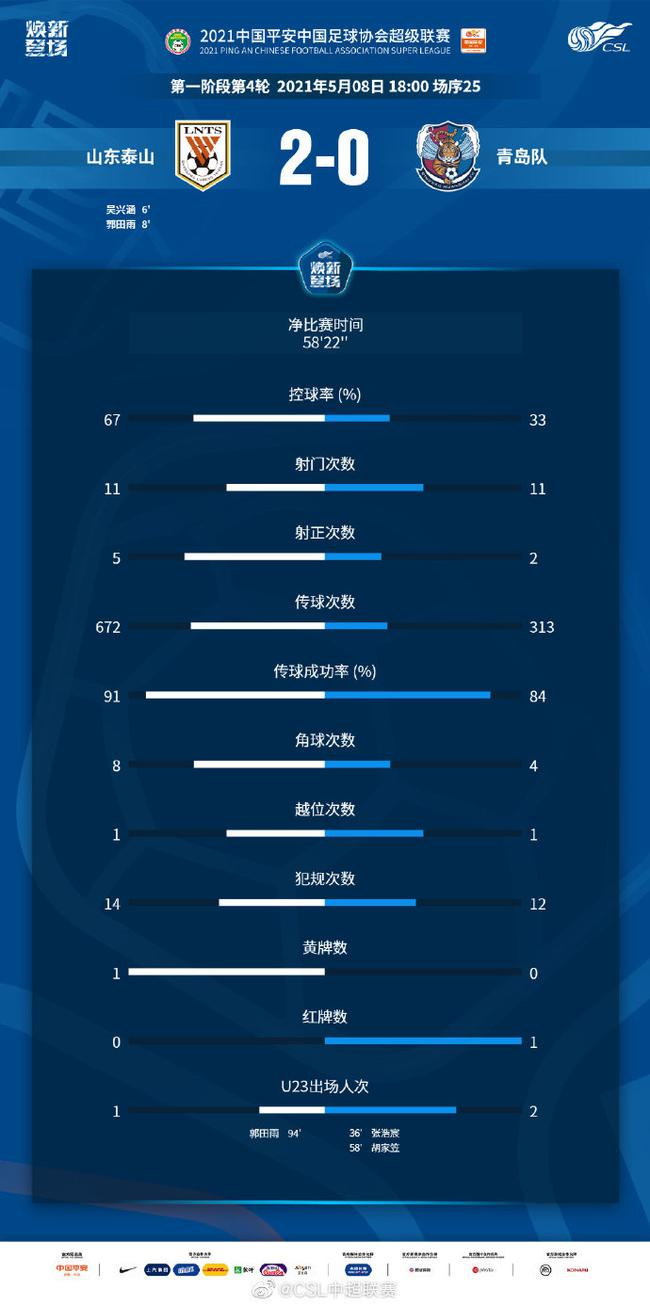 5月8日晚,2021赛季中超联赛第4轮比赛上演齐鲁德比,凭借吴兴涵和郭田雨的头球破门,山东泰山队2-0击败青岛队,前四轮3胜1平保持不败,继续领跑中超积分榜。
