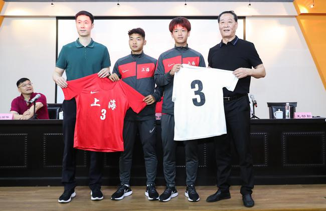 上海市体育局竞技体育处处长王励勤和上海足协主席柳海光与球员代表一起展示主客场球衣。