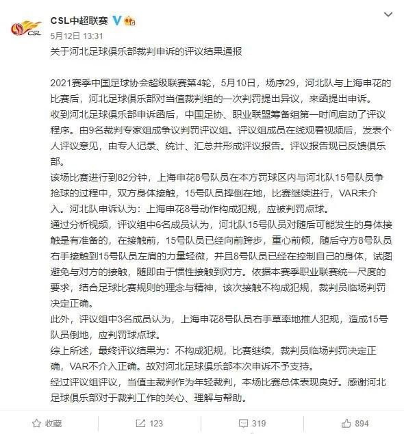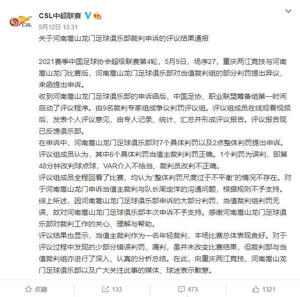 记者程善报道 2021年5月12日中午13:30分,在中国足协官方网站以及中超联赛的官方微博上,分别发布了对第四轮违纪球员的处罚结果,以及对河南嵩山龙门足球俱乐部、河北足球俱乐部申诉裁判争议的公开回复。这是自中国职业联赛成立以来,联赛管理部门首度就争议判罚直面俱乐部的质疑,在职业联盟筹备组争议判罚评议组专业评议并给出最终意见的同时,对公众公开发布,体现了职业联盟筹备组想要营造良好联赛氛围、进一步统一判罚尺度的决心。