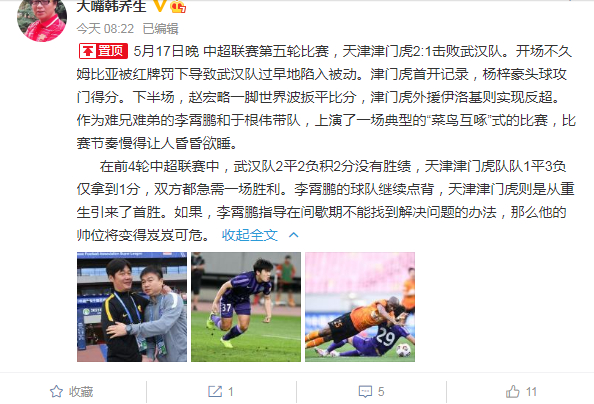 韩乔生在个人微博上写道:“5月17日晚 中超联赛第五轮比赛,天津津门虎2:1击败武汉队。开场不久姆比亚被红牌罚下导致武汉队过早地陷入被动。津门虎首开记录,杨梓豪头球攻门得分。下半场,赵宏略一脚世界波扳平比分,津门虎外援伊洛基则实现反超。作为难兄难弟的李霄鹏和于根伟带队,上演了一场典型的“菜鸟互啄”式的比赛,比赛节奏慢得让人昏昏欲睡。”