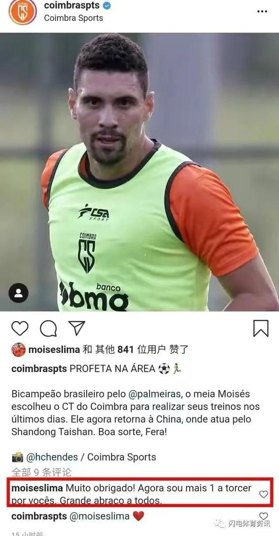 近日,泰山队外援莫伊塞斯也有了新动态,巴西的科英布拉体育队官方发文表示,此前一直跟随球队训练的莫伊塞斯结束了最后的训练,并祝福了莫伊塞斯,之后莫伊塞斯也在个人社交平台更新了动态,感谢了俱乐部和介绍他跟队训练的好友,还晒出了两人的合影。从种种迹象来看,莫伊塞斯的归队已经提上了日程。