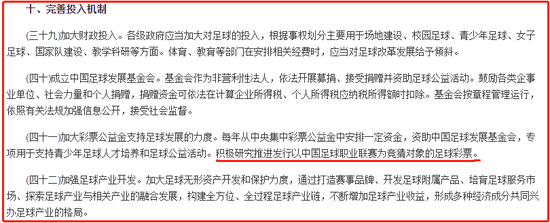 国家体育总局在2016年发布的《体育发展“十三五”规划》中,也提到“加快体育彩票创新步伐,积极研究推进发行以中国足球职业联赛为竞猜对象的足球彩票。”