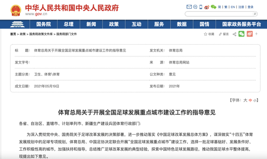 此前体育总局再次发布了《关于开展全国足球发展重点城市建设工作的指导意见》。其中特别提到,‘十四五’时期,全国目标建成16-18个政府重视程度高、足球底蕴好、管理体制机制顺畅、训练竞赛体系完备、足球发展基础坚实、足球文化氛围浓厚的重点城市。