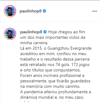 而在社交平台中,保利尼奥则写道:今天,我足球生涯中最重要的一个阶段之一走到了尽头。2015年,广州恒大俱乐部给予了我信任,并对我的实力充满信心,74个进球、172场比赛和8个冠军是对我们合作成果的真实写照。这也是对我的职业和个人生活而言相当精彩与特殊的几年,我会将这些美好记忆珍藏。新冠疫情深刻地改变了世界时局,于我而言,很不幸,疫情导致了我与俱乐部的提前告别。我心里非常难过,但我是带着“任务完成”的心情离开。 在此,我衷心感谢俱乐部、我的同事们和我在中国交到的朋友!广州恒大,谢谢你!中国,谢谢你!