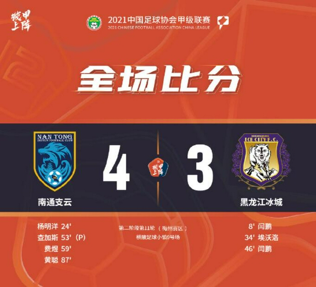 北京时间7月11日下午17点,2021年中甲联赛第二阶段第11轮开始首场较量,由南通支云迎战黑龙江冰城,比赛场地是横陂足球小镇9号场。上半场第8分钟,黑龙江队通过一次快速反击,由闫鹏打入一球。第23分钟杨明洋禁区线上兜射扳平比分。第33分钟埃沃洛禁区线上拿球过掉宋浩宇,接着打门再次反超比分。半场黑龙江2比1领先。