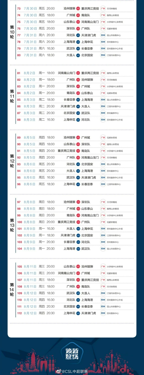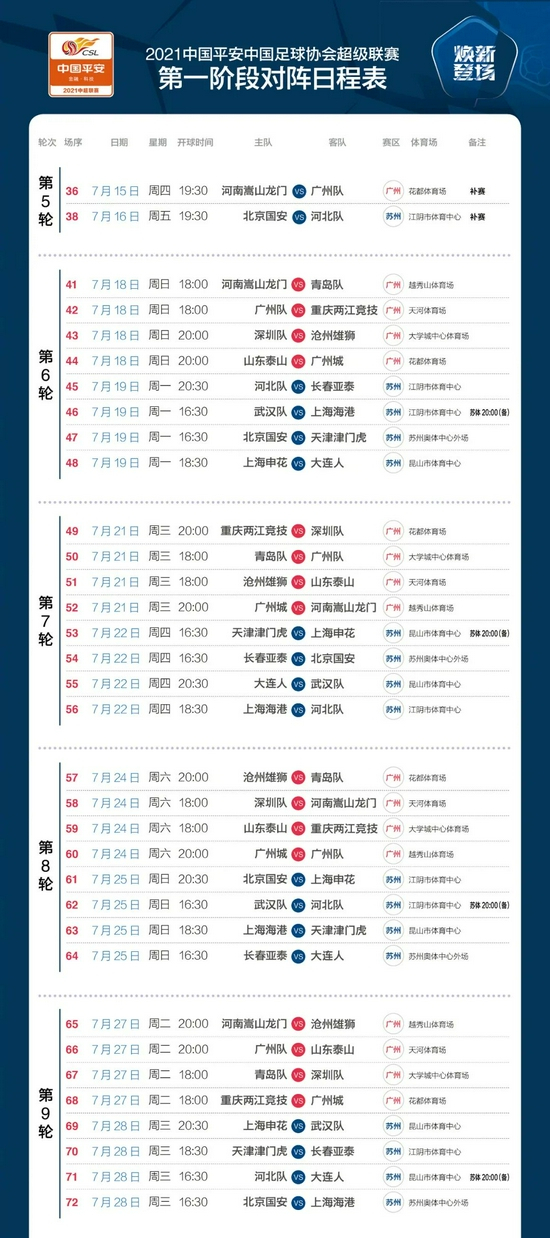 记者陈永报道 7月13日,中超联赛官方公布了2021中超第6到14轮的最新赛程(含第5轮的两场补赛),广州赛区和苏州赛区的两场补赛在15日和16日分别进行,而第6轮到第14轮的比赛,则分别于7月18日和19日打响,8月11日和12日结束。在这全新的赛程中,苏州赛区的比赛时间及地点发生了重大的变化。