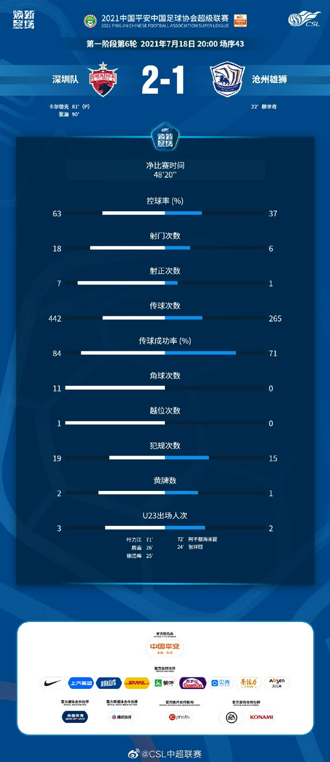 7月18日,中超第6轮,深圳队对阵沧州雄狮。上半场穆里奇破门,卡尔德克主罚点球扳平比分,张源90分钟破门,最终深圳2-1逆转沧州。