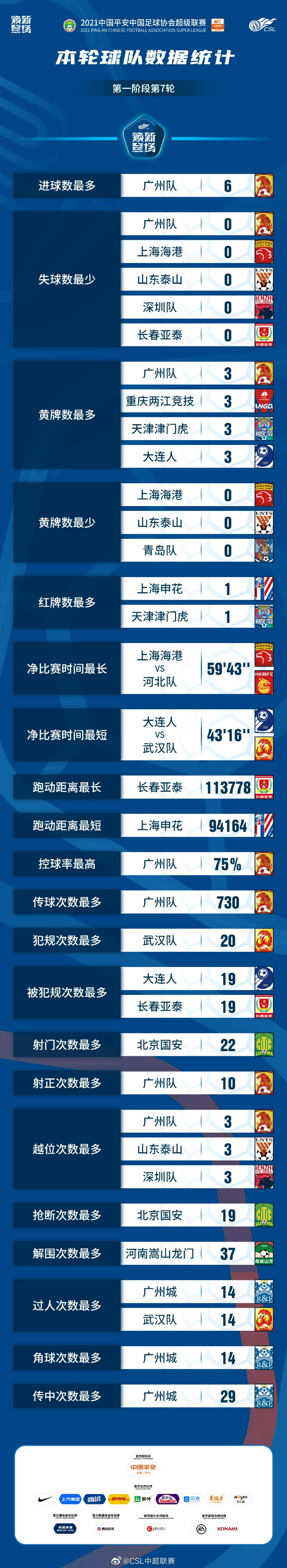 中超第7轮统计:广州队6球进球最多 零失球最少