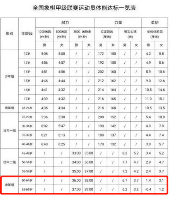 棋类运动需要适当的身体素质的锻炼,这能理解。但不同体育项目和级别应该科学制定,你让69岁的大爷快走3000米+投掷实心球6.2米以上,是不是太难了?