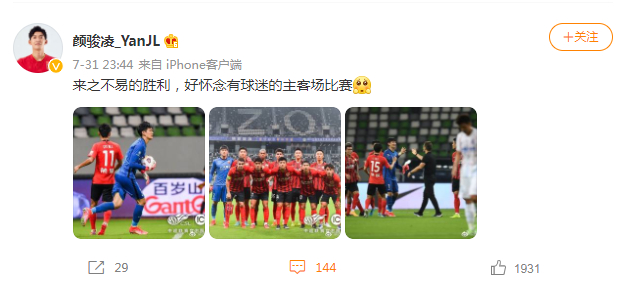 颜骏凌在微博中写道:“来之不易的胜利,怀念有球迷的主客场比赛。”