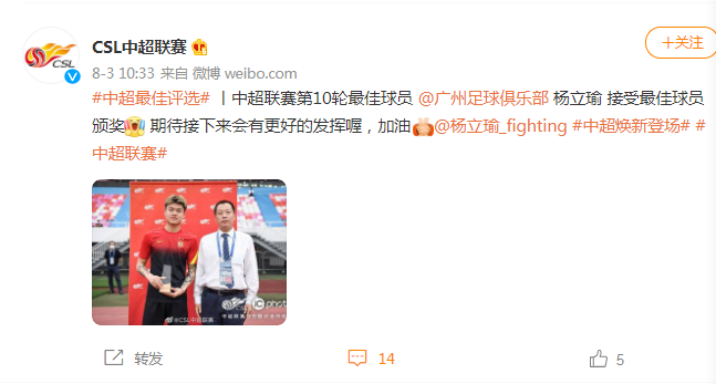 8月3日,中超官方发布,为第9轮最佳球员杨立瑜颁奖。