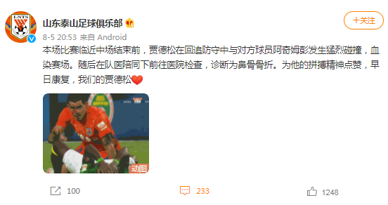 山东泰山官方写道:本场比赛临近中场结束前,贾德松在回追防守中与对方球员阿奇姆彭发生猛烈碰撞,血染赛场。随后在队医陪同下前往医院检查,诊断为鼻骨骨折。为他的拼搏精神点赞,早日康复,我们的贾德松。