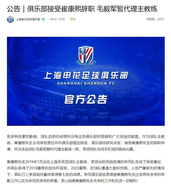 对于崔康熙的请辞,俱乐部领导经过深思熟虑后,同意了请求。8月7日,申花正式官宣,崔康熙辞职,毛毅军代理主帅。
