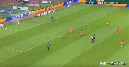 比赛第22分钟,深圳队获得球门球,裁判员用右手示意球门球,其实这算问题吗?在小编看来不算,但是某些学过裁判,受中国裁判教条思维影响比较深,认为这样示意不合理。对,就小编那时学习裁判时,讲师给的就是必须是左手示意球门球手势,这样的话,能面对着自己的助理裁判员,能更好的眼神交流。的确,这样教,这样学是没有问题的。但是,所有的都要用于实践,对于一些是角球还是球门球不是很明显的和助理裁判员眼神交流很重要,但是对于非常明显的球门球,哪个手示意没有什么区别。另外,在职业联赛中,裁判员配备的耳麦交流我认为比眼神交流好用多了。当然,作为基层业余裁判员,没有耳麦等辅助设备的情况下,多和助理裁判员交流,对帮助自己顺利完成执法有很大帮助!