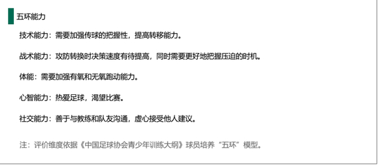这份报告中,五环能力成为亮点,它依据《中国足球协会青少年训练大纲》中球员培养“五环”模型设置,全面评估球员技术、战术、身体、心智和社交等能力,建立起个体球员五环评价模型。特别结合中国青少年球员性格特点,对球员心智和社交能力,提出具体化要求,这一点也在向国际足坛最新发展方向接轨。