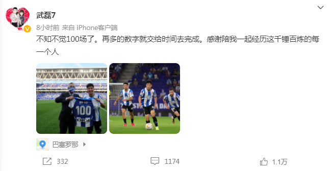 武磊写道:“不知不觉100场了。再多的数字就交给时间去完成。感谢陪我一起经历这千锤百炼的每一个人 。”