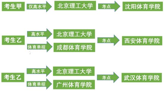 如上图所示,甲乙丙三位考生,因为报考策略的不同,尽管都报了北京理工大学的高水平,却是在不同的考点进行测试。
