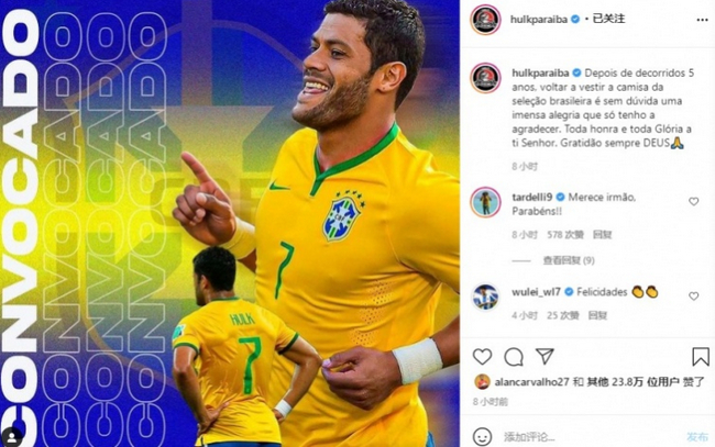 胡尔克发文庆祝时隔5年重返巴西国家队 武磊祝贺