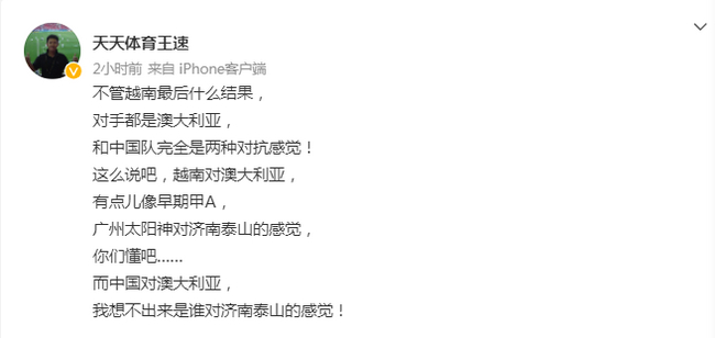 9月7日晚上,12强赛第二轮,中国队同组的越南0-1不敌澳大利亚。赛后北京台评论员王速在个人微博上点评了比赛。