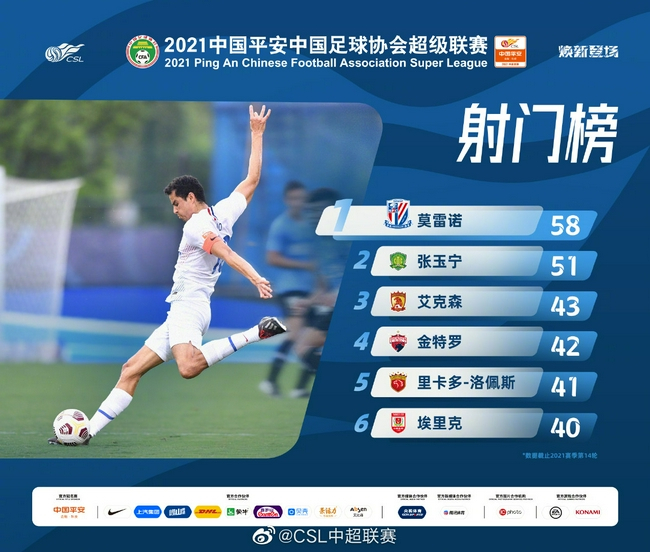 中超官方发布射门榜:莫雷诺58次居首 张玉宁次席