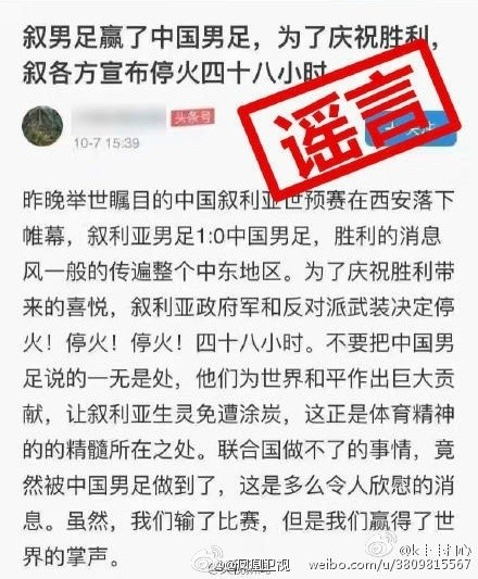 从谣言还能引出明显的恶搞,咱们的国足正八儿经搞不定战火中的叙利亚队,于是前些年出现了这样的说法:叙利亚各方停火了!只因叙利亚队战胜了国足。